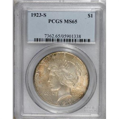 <B>1923-S $1 MS65 PCGS.</B></I> While more than 19 million pieces were struck of the 1923-S dollar, it is a rare find in Gem condition. This is a pleasing example that has silver-gray centers with deeper, spotted golden-rose peripheries. Minimally abraded for the issue with only slight softness in the centers.<BR><BR><B>Coin Engraver:</B> Anthony de Francisci<BR><BR><b>Shipping:</b> Coins & Currency (<a target="_blank" href="http://www.heritageauctions.com/common/shipping.php">view shipping information</a>)