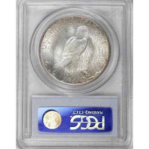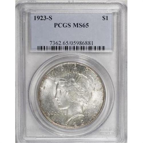 <B>1923-S $1 MS65 PCGS.</B></I> A condition rarity is defined as a coin that appears to be common, but seldom seen in high grades. Such is the case with the '23-S Peace dollar, with a mintage of 19 million coins, and enough examples available that any collector can acquire an attractive piece. However, survivors in full Gem condition are seldom encountered. For example PCGS has only certified 100 MS65 examples, and just three finer coins. This translates to one Gem for every 190,000 coins originally minted! The present example is slightly soft at the central obverse, but with all other details generally sharp. The surfaces are frosty and lustrous with a trace of gold toning.<BR><BR><B>Coin Engraver:</B> Anthony de Francisci<BR><BR><b>Shipping:</b> Coins & Currency (<a target="_blank" href="http://www.heritageauctions.com/common/shipping.php">view shipping information</a>)