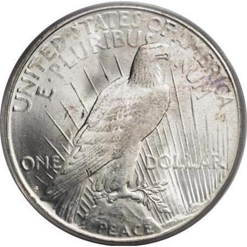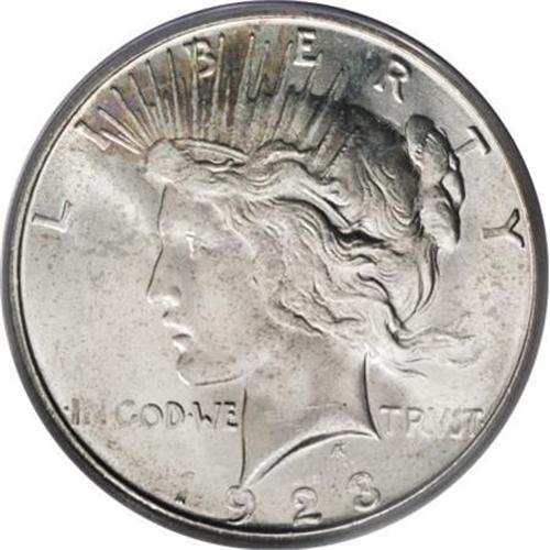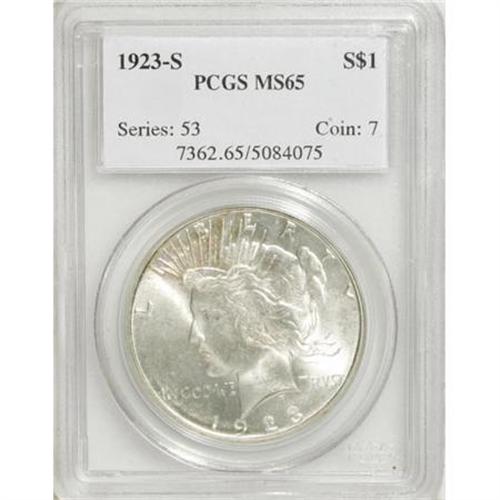 <B>1923-S $1 MS65 PCGS.</B></I> Booming luster and smooth surfaces confirm the high quality of this San Francisco Gem. Peach and lilac patina congregates on the left half of the tiara, but most of the obverse is untoned. The reverse features wisps of golden-brown and mauve. This example is interesting for its heavy reverse clash marks, which include a pair of "Shoulder Spikes" east of the eagle's neck.<BR><BR><B>Coin Engraver:</B> Anthony de Francisci<BR><BR><b>Shipping:</b> Coins & Currency (<a target="_blank" href="http://www.heritageauctions.com/common/shipping.php">view shipping information</a>)