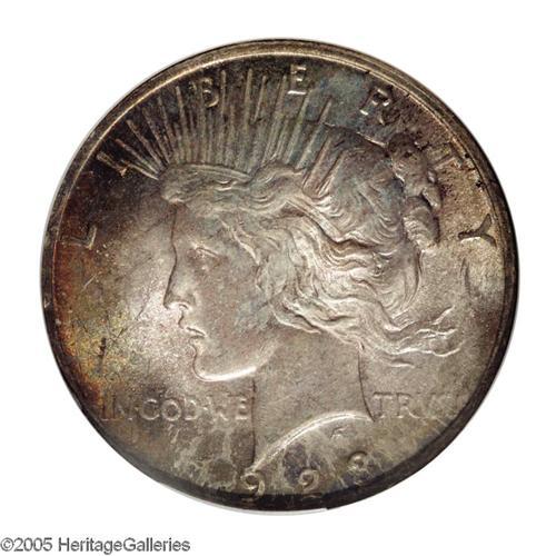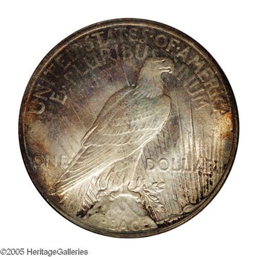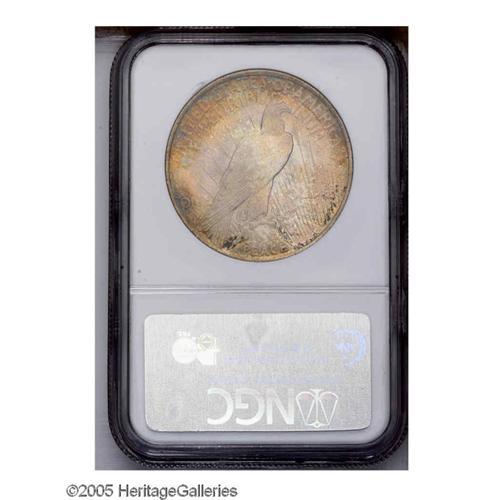 <B>1923<S$1> MS66 NGC.</B></I> This lovely Peace dollar possesses considerable flash. Radiant luster, combined with sharply struck devices, generates great eye appeal. Attractive violet toning dances over the centers, while golden-orange, green, and lavender colors gravitate to the borders. A few minute marks on Liberty's cheek, and a milling mark in the left (facing) obverse field are mentioned for accuracy. NGC has certified only 28 pieces finer (11/05).