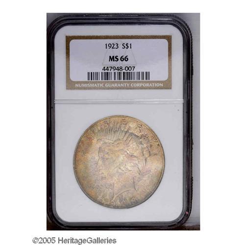 1923 S$1 MS66 NGC. This lovely Peace dollar possesses 1923[S$1] MS66 NGC.