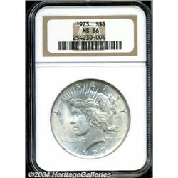 <B>1923<S$1> MS66 NGC.</B></I> A lightly toned, satiny example with especially clean surfaces for this typically well abraded issue. Nicely struck design elements. <BR><BR><B>Important notice:</B> Heritage usually auctions material at the rate of 200-250 lots per hour. On some occasions eBay Live bid software or the Internet may not be able to keep up with the pace of the auction. We recommend placing a realistic absentee bid now as insurance to avoid disappointment. Occasionally the auctioneer may eliminate or reject an eBay Live bid, and the auctioneer may also reopen a lot after the close of the eBay live bidding (usually because we missed an audience bid), and may reject your bid even if it shows you as the winning bidder. By bidding via eBay Live, you agree that Heritage may award the lot to another bidder at its sole discretion under the circumstances described above or any other reasonable circumstances. Since eBay bids are not shown to us until we open the lot on the floor, we treat those bids just like floor bids. In most cases the floor responds before the eBay bid is presented to us, due to Internet lag time, so for consistency we have made it a policy that floor bids are always considered first over tie eBay live bids. Also please note that all Heritage lots purchased through eBay Live carry a 20% Buyer's Premium. Please make sure you read the Terms and Conditions before you bid. </span></font></tr></table></td></tr></table>