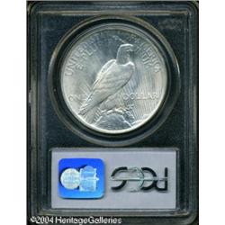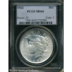 1923 S$1 MS66 PCGS. Flashy luster and well struck <B>1923 S$1 MS66 PCGS.</B></I> Flashy luster and well struck motifs are the hallmark of this lovely Peace dollar. The untoned surfaces exhibit just a few tiny marks. <BR><BR><B>Important notice:</B> Heritage usually auctions material at the rate of 200-250 lots per hour. On some occasions eBay Live bid software or the Internet may not be able to keep up with the pace of the auction. We recommend placing a realistic absentee bid now as insurance to avoid disappointment. Occasionally the auctioneer may eliminate or reject an eBay Live bid, and the auctioneer may also reopen a lot after the close of the eBay live bidding (usually because we missed an audience bid), and may reject your bid even if it shows you as the winning bidder. By bidding via eBay Live, you agree that Heritage may award the lot to another bidder at its sole discretion under the circumstances described above or any other reasonable circumstances. Since eBay bids are not shown to us until we open the lot on the floor, we treat those bids just like floor bids. In most cases the floor responds before the eBay bid is presented to us, due to Internet lag time, so for consistency we have made it a policy that floor bids are always considered first over tie eBay live bids. Also please note that all Heritage lots purchased through eBay Live carry a 20% Buyer's Premium. Please make sure you read the Terms and Conditions before you bid. This lot is being auctioned in conjunction with a live floor auction by Heritage Galleries & Auctioneers. All final auction and invoice information will be supplied by Heritage Galleries & Auctioneers, and all other information should be considered preliminary. Lot:7785