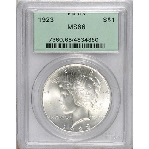 <B>1923 S$1 MS66 PCGS.</B></I> Light chestnut-gold and ice-blue toning graces this sharply struck and clean-cheeked silver type coin. Encased in a green label holder.<BR><BR><b>Shipping:</b> Coins & Currency (<a target="_blank" href="http://www.heritageauctions.com/common/shipping.php">view shipping information</a>)