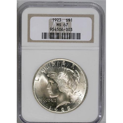 <B>1923<img border='0' src='http://www.heritagecoins.com/images/star.gif' width=10 height=10>$1> MS67 NGC.</B></I> Absolutely phenomenal quality. The surfaces are fully struck and show smooth, unblemished mint frost. The original mint brilliance is only accented by the slightest dab of golden-brown patina in the left and right obverse fields. Despite its commonness as an issue, even the 1923-P is scarce at this lofty grade level. Census: 35 in 67, none are finer at either service (6/06).