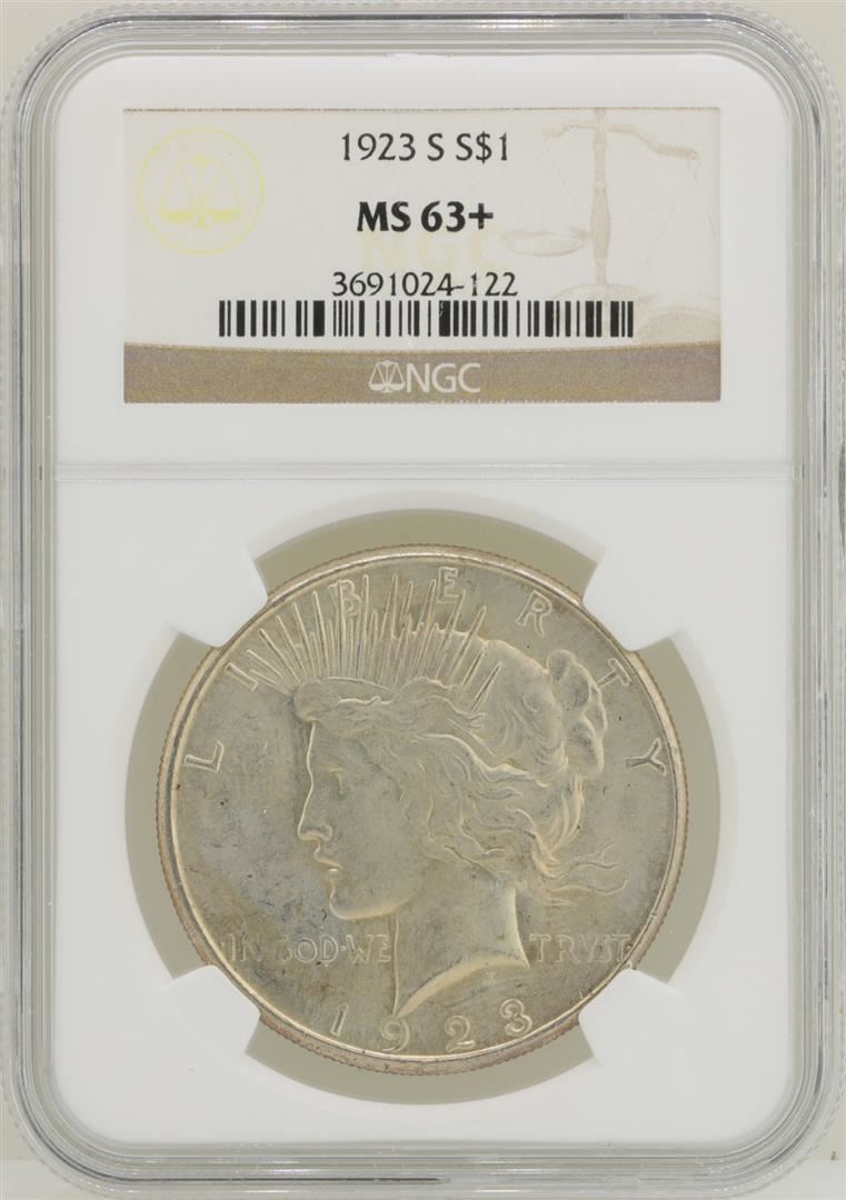 One 1923-S $1 Peace Silver Dollar Coin NGC MS63+. NGC Certified.