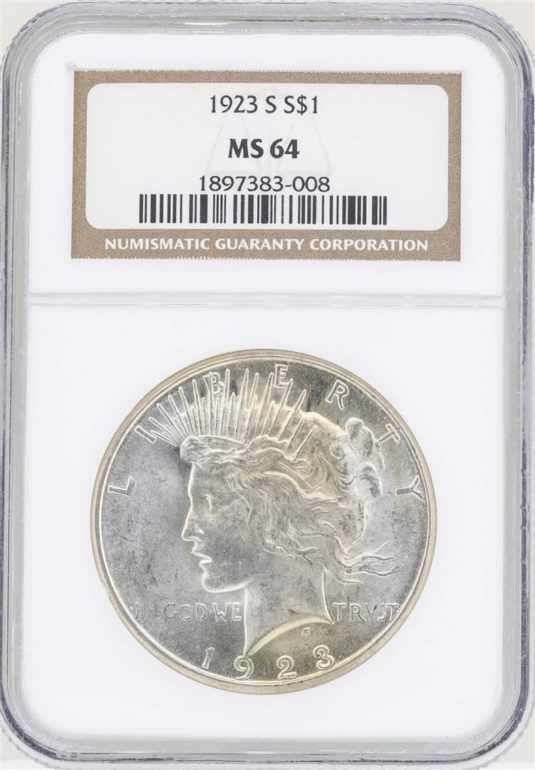 One 1923-S $1 Peace Silver Dollar Coin NGC MS64. NGC Certified.