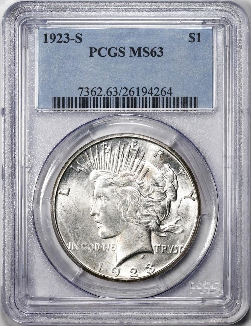 One 1923-S $1 Peace Silver Dollar Coin PCGS MS63. PCGS Graded.