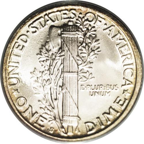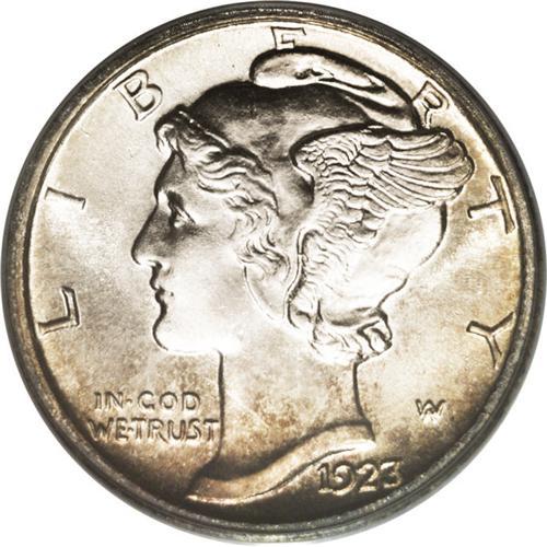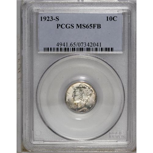 <B>1923-S<10C> MS65 Full Bands PCGS.</B></I> Light autumn-brown shades grace the lower obverse, and visit the reverse rim. This highly lustrous Gem has outstanding eye appeal, and the strike is razor-sharp, on both the central bands and the peripheral letters. The fields are refreshingly devoid of abrasions. Population: 27 in 65, 5 finer (9/06).