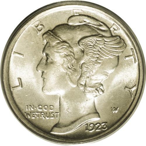<B>1923-S<10C> MS65 Full Bands PCGS.</B></I> Scarce in all grades above XF, the difficulty of this issue in Mint State is compounded by the numerous coins that have flat central or lower bands or extensive fadeaway at the peripheries. This piece is strongly defined with exceptionally pronounced central bands on the reverse. The only area of weakness is at the bottom of the letters in ONE, and this is certainly not distracting. Brilliant and highly lustrous, each side shows several small abrasions, these being the only deterrent to an even higher grade. Population: 27 in 65, 5 finer (7/06).