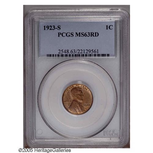 <B>1923-S<1C> MS63 Red PCGS.</B></I> The mint luster is intact with traces of fingerprints on each side. A bit softly struck, as usual, with numerous small abrasions present.