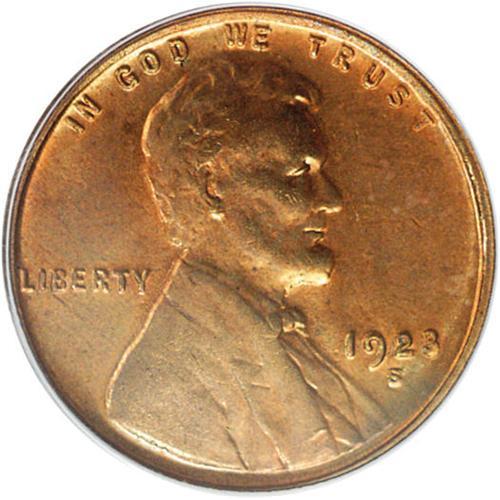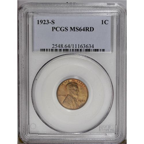 <B>1923-S<1C> MS64 Red PCGS.</B></I> The secret is out on the 1923-S Lincoln, tough as nails in well struck Choice and better condition. This bright, glossy representative is accented in beautiful iridescent toning and, while not sharply detailed in the truest sense, it is way above-average for the issue. Population: 57 in 64, 16 finer (3/06).<BR><I>From The Kendall Marie #4 All-Time Finest PCGS Registry of Lincoln Cents with Varieties, Circulation Strikes, 1909-1958.</B></I> <BR><BR><B>Important notice:</B> Heritage usually auctions material at the rate of 200-250 lots per hour. On some occasions eBay Live bid software or the Internet may not be able to keep up with the pace of the auction. We recommend placing a realistic absentee bid now as insurance to avoid disappointment. Occasionally the auctioneer may eliminate or reject an eBay Live bid, and the auctioneer may also reopen a lot after the close of the eBay live bidding (usually because we missed an audience bid), and may reject your bid even if it shows you as the winning bidder. By bidding via eBay Live, you agree that Heritage may award the lot to another bidder at its sole discretion under the circumstances described above or any other reasonable circumstances. Since eBay bids are not shown to us until we open the lot on the floor, we treat those bids just like floor bids. In most cases the floor responds before the eBay bid is presented to us, due to Internet lag time, so for consistency we have made it a policy that floor bids are always considered first over tie eBay live bids. Also please note that all Heritage lots purchased through eBay Live carry a 20% Buyer's Premium. Please make sure you read the Terms and Conditions before you bid. This lot is being auctioned in conjunction with a live floor auction by Heritage Galleries & Auctioneers. All final auction and invoice information will be supplied by Heritage Galleries & Auctioneers, and all other information should be considered preliminary. Lot:508 <BR><BR><B>Winning Notification and Billing:</B> After the FINAL session in this auction is complete, Heritage will send e-mail and snail mail invoices. This process normally takes several days. All final auction and invoice information will be supplied by Heritage Galleries & Auctioneers, and all other information should be considered preliminary. <BR><BR>This auction will be conducted on a live auction floor and over the Internet through eBay Live. If you choose to place an absentee bid, please take a moment to <font color='#0000ff'><u><a href='http://pages.ebay.com/liveauctions/help/before/laabsentee.html'>learn how eBay Live absentee bidding works</a></u></font><font color='#000000'>