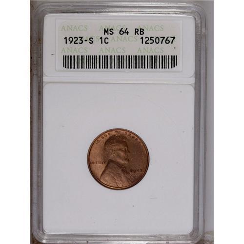 <B>1923-S 1C MS64 Red and Brown ANACS.</B></I> Lustrous amber and golden surfaces, while far from fully struck, are much better defined than the typical Mint State 1923-S. Only since certification data became available have collectors come to appreciate the scarcity of this issue in Choice and finer condition.