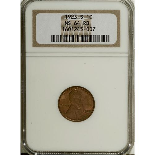 <B>1923-S 1C MS64 Red and Brown NGC.</B></I> NGC Census: (84/36). PCGS Population (103/14). Mintage: 8,700,000. Numismedia Wsl. Price for NGC/PCGS coin in MS64: $850. (#2547)<BR><BR><b>Shipping:</b> Coins & Currency (<a target="_blank" href="http://www.heritageauctions.com/common/shipping.php">view shipping information</a>)