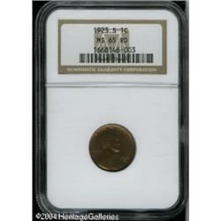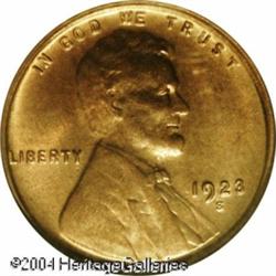 1923-S 1C MS65 Red NGC. An attractive, unabraded, <B>1923-S 1C MS65 Red NGC.</B></I> An attractive, unabraded, and virtually carbon-free Gem that has consistent rose-gold color. The strike is bold for the issue, with no apparent weakness on Lincoln's shoulder or the O in ONE, although die wear (as made) has softened some of the details of the design. Scarce in all Mint State grades, the 1923-S is generally found in Brown or spotted Red and Brown condition. Population: 2 in 65 Red, none finer (11/04). <BR><BR><B>Important notice:</B> Heritage usually auctions material at the rate of 200-250 lots per hour. On some occasions eBay Live bid software or the Internet may not be able to keep up with the pace of the auction. We recommend placing a realistic absentee bid now as insurance to avoid disappointment. Occasionally the auctioneer may eliminate or reject an eBay Live bid, and the auctioneer may also reopen a lot after the close of the eBay live bidding (usually because we missed an audience bid), and may reject your bid even if it shows you as the winning bidder. By bidding via eBay Live, you agree that Heritage may award the lot to another bidder at its sole discretion under the circumstances described above or any other reasonable circumstances. Since eBay bids are not shown to us until we open the lot on the floor, we treat those bids just like floor bids. In most cases the floor responds before the eBay bid is presented to us, due to Internet lag time, so for consistency we have made it a policy that floor bids are always considered first over tie eBay live bids. Also please note that all Heritage lots purchased through eBay Live carry a 20% Buyer's Premium. Please make sure you read the Terms and Conditions before you bid. This lot is being auctioned in conjunction with a live floor auction by Heritage Galleries & Auctioneers. All final auction and invoice information will be supplied by Heritage Galleries & Auctioneers, and all other information should be considered preliminary. Lot:5292