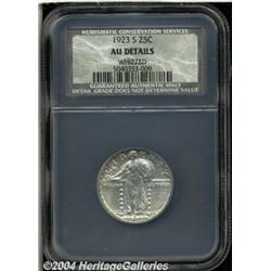 <B>1923-S<25C> AU50 Details, Whizzed, NCS.</B></I> Well struck with subdued luster, two or three tiny contact marks on each side, and a somewhat unnatural appearance from having been whizzed. Still a well detailed and pleasing example of this semi-key date coin.<BR><I>From The Barry Donnell Collection, Part Two.</B></I> <BR><BR><B>Important notice:</B> Heritage usually auctions material at the rate of 200-250 lots per hour. On some occasions eBay Live bid software or the Internet may not be able to keep up with the pace of the auction. We recommend placing a realistic absentee bid now as insurance to avoid disappointment. Occasionally the auctioneer may eliminate or reject an eBay Live bid, and the auctioneer may also reopen a lot after the close of the eBay live bidding (usually because we missed an audience bid), and may reject your bid even if it shows you as the winning bidder. By bidding via eBay Live, you agree that Heritage may award the lot to another bidder at its sole discretion under the circumstances described above or any other reasonable circumstances. Since eBay bids are not shown to us until we open the lot on the floor, we treat those bids just like floor bids. In most cases the floor responds before the eBay bid is presented to us, due to Internet lag time, so for consistency we have made it a policy that floor bids are always considered first over tie eBay live bids. Also please note that all Heritage lots purchased through eBay Live carry a 20% Buyer's Premium. Please make sure you read the Terms and Conditions before you bid. </span></font></tr></table></td></tr></table>