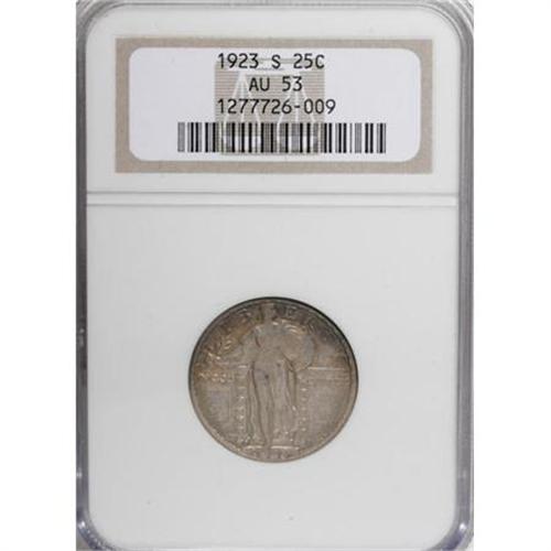 <B>1923-S 25C AU53 NGC.</B></I> Elegant sunset-orange patina drapes most of the obverse, while a crescent of azure appears at the upper margin. The still-lustrous reverse shows a melange of cerulean, violet, and rose.<BR><BR><B>Coin Engraver:</B> Hermon A. MacNeil<BR><BR><b>Shipping:</b> Coins & Currency (<a target="_blank" href="http://www.heritageauctions.com/common/shipping.php">view shipping information</a>)