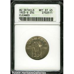 <B>1923-S 25C --Cleaned--ANACS. AU Details, Net XF45.</B></I> A few wispy hairlines are noted in localized areas on silver-gray surfaces that show traces of faint tan color at the left obverse border. A short pinscratch runs through the lower part of the shield. This is a fairly nice coin overall, despite the minor, unobtrusive impairments.