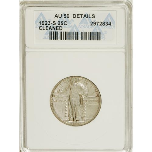 <B>1923-S 25C --Cleaned--ANACS. AU50 Details.</B></I> The light smoke-gray and golden fields still retain considerable luster and appeal, despite ANACS' disclaimer. The bottom of the 2 in the is beginning to fill in, a common design flaw on pre-1925 issues.<BR><BR><b>Shipping:</b> Coins & Currency (<a target="_blank" href="http://www.heritageauctions.com/common/shipping.php">view shipping information</a>)