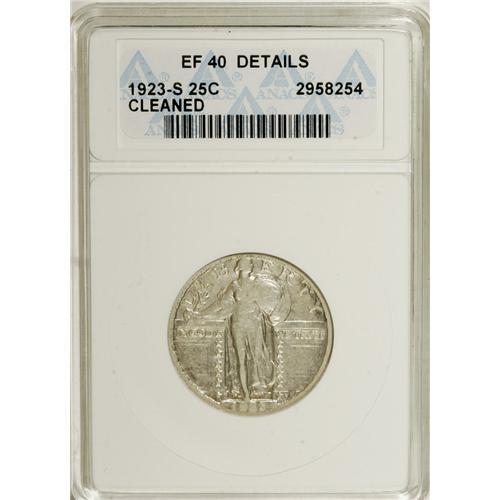 <B>1923-S 25C --Cleaned--ANACS. XF40 Details.</B></I> The date quickly wore off pre-1925 Standing Liberty quarters, and low mintage issues with clear dates from this era are in demand. On the present piece, the 2 is faint, but legible. The 19 is clear, and the 3 is bold. A subdued piece with minor granularity on the lower reverse field, and a mark above the Q in QUARTER.<BR><BR><b>Shipping:</b> Coins & Currency (<a target="_blank" href="http://www.heritageauctions.com/common/shipping.php">view shipping information</a>)