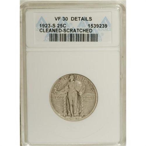<B>1923-S 25C --Cleaned, Scratched--ANACS. VF30 Details.</B></I> NGC Census: (9/275). PCGS Population (23/483). Mintage: 1,360,000. Numismedia Wsl. Price for NGC/PCGS coin in VF30: $628. (#5744)<BR><BR><b>Shipping:</b> Coins & Currency (<a target="_blank" href="http://www.heritageauctions.com/common/shipping.php">view shipping information</a>)