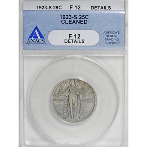 <B>1923-S 25C --Cleaned--ANACS. Fine 12 Details.</B></I> NGC Census: (6/315). PCGS Population (17/623). Mintage: 1,360,000. Numismedia Wsl. Price for NGC/PCGS coin in F12: $550. (#5744)<BR><BR><B>Coin Engraver:</B> Hermon A. MacNeil<BR><BR><b>Shipping:</b> Coins & Currency (<a target="_blank" href="http://www.heritageauctions.com/common/shipping.php">view shipping information</a>)