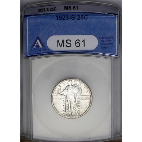 <B>1923-S<25C> MS61 ANACS.</B></I> A lightly toned and lustrous low mintage Standing Liberty quarter with barely a hint of gold toning. The absence of an ear hole prevents a Full Head designation, but the strike is generally crisp. Faint slide marks on the waist and legs decide the grade. A small planchet flaw, as made, separates WE TRVST.