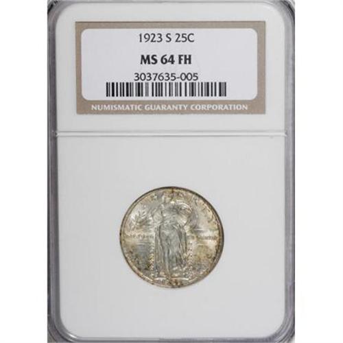 <B>1923-S 25C MS64 Full Head NGC.</B></I> The 1923-S is an important key date in the Standing Liberty quarter series. MS65 Full Head examples are scarce (J.H. Cline, 2007), and even near-Gem Full Heads, such as the piece in the current lot, are tough to locate. Whispers of copper-gold color are scattered about, concentrating at the borders, and dazzling luster exudes from both sides. An attentive strike transcends Liberty's Full Head to brings out sharp definition in the other design elements, including the chain mail, the inner shield, and all but two of the rivets. Close scrutiny reveals no significant marks.<BR><BR><b>Shipping:</b> Coins & Currency (<a target="_blank" href="http://www.heritageauctions.com/common/shipping.php">view shipping information</a>)