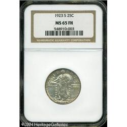 1923-S 25C MS65 Full Head NGC. Light apricot patin <B>1923-S 25C MS65 Full Head NGC.</B></I> Light apricot patina endows this lustrous and exceptionally preserved Gem. Well struck aside from a couple of shield rivets and the tops of the date. Liberty's head is exquisitely defined. The low mintage 1923-S is treasured in all grades. Full Head Gems are decidedly rare and are subject to strong collector demand. <BR><BR><B>Important notice:</B> Heritage usually auctions material at the rate of 200-250 lots per hour. On some occasions eBay Live bid software or the Internet may not be able to keep up with the pace of the auction. We recommend placing a realistic absentee bid now as insurance to avoid disappointment. Occasionally the auctioneer may eliminate or reject an eBay Live bid, and the auctioneer may also reopen a lot after the close of the eBay live bidding (usually because we missed an audience bid), and may reject your bid even if it shows you as the winning bidder. By bidding via eBay Live, you agree that Heritage may award the lot to another bidder at its sole discretion under the circumstances described above or any other reasonable circumstances. Since eBay bids are not shown to us until we open the lot on the floor, we treat those bids just like floor bids. In most cases the floor responds before the eBay bid is presented to us, due to Internet lag time, so for consistency we have made it a policy that floor bids are always considered first over tie eBay live bids. Also please note that all Heritage lots purchased through eBay Live carry a 20% Buyer's Premium. Please make sure you read the Terms and Conditions before you bid. This lot is being auctioned in conjunction with a live floor auction by Heritage Galleries & Auctioneers. All final auction and invoice information will be supplied by Heritage Galleries & Auctioneers, and all other information should be considered preliminary. Lot:5953