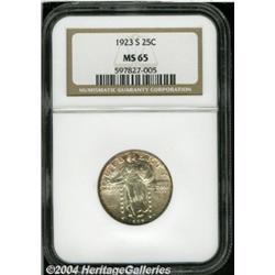 <B>1923-S<25C> MS65 NGC.</B></I> Nearly brilliant with vivacious luster on the obverse, the reverse of this coin is striking as vibrant purple patina is contained by a thin outer ring of antique-gold coloration. In addition to its visual superiority, marks are few and far between. <BR><BR><B>Important notice:</B> Heritage usually auctions material at the rate of 200-250 lots per hour. On some occasions eBay Live bid software or the Internet may not be able to keep up with the pace of the auction. We recommend placing a realistic absentee bid now as insurance to avoid disappointment. Occasionally the auctioneer may eliminate or reject an eBay Live bid, and the auctioneer may also reopen a lot after the close of the eBay live bidding (usually because we missed an audience bid), and may reject your bid even if it shows you as the winning bidder. By bidding via eBay Live, you agree that Heritage may award the lot to another bidder at its sole discretion under the circumstances described above or any other reasonable circumstances. Since eBay bids are not shown to us until we open the lot on the floor, we treat those bids just like floor bids. In most cases the floor responds before the eBay bid is presented to us, due to Internet lag time, so for consistency we have made it a policy that floor bids are always considered first over tie eBay live bids. Also please note that all Heritage lots purchased through eBay Live carry a 20% Buyer's Premium. Please make sure you read the Terms and Conditions before you bid. </span></font></tr></table></td></tr></table>