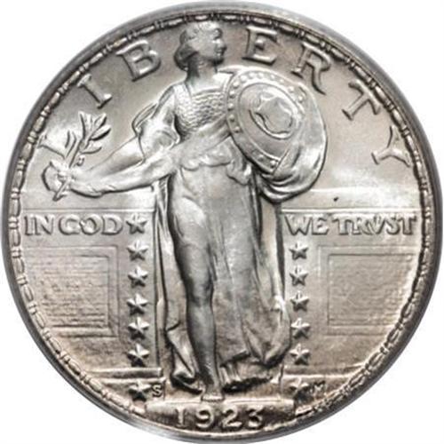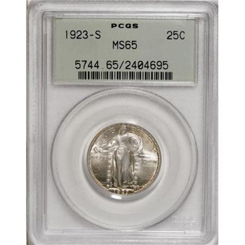 <B>1923-S 25C MS65 PCGS.</B></I> This radiantly lustrous '23-S displays occasional whispers of violet-gold patina at the margins, most noticeable along the upper reverse. A well executed strike emboldens the design elements, including the stripes of the inner shield and Liberty's chain mail. Even Liberty's head, though not full, exhibits sharp definition. An inoffensive mark or two on each side is all that stands in the way of a higher grade. Housed in a green-label holder. Population: 82 in 65, 28 finer (11/07).<BR><BR><B>Coin Engraver:</B> Hermon A. MacNeil<BR><BR><b>Shipping:</b> Coins & Currency (<a target="_blank" href="http://www.heritageauctions.com/common/shipping.php">view shipping information</a>)