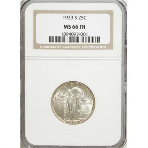 <B>1923-S 25C MS66 Full Head NGC.</B></I> This is a vibrant Premium Gem of the highest quality, with bold striking detail. There are some hints of light champagne toning on each side. We can scarcely imagine a finer example of this low-mintage Standing Liberty key date, which makes it seem surprising that several have been graded even higher. Census: 26 in 66 Full Head, 6 finer (10/07). <BR><I>From The Hoffy Collection, NGC's #3 Registry Collection of Standing Liberty Quarters.</B></I><BR><BR><B>Coin Engraver:</B> Hermon A. MacNeil<BR><BR><b>Shipping:</b> Coins & Currency (<a target="_blank" href="http://www.heritageauctions.com/common/shipping.php">view shipping information</a>)