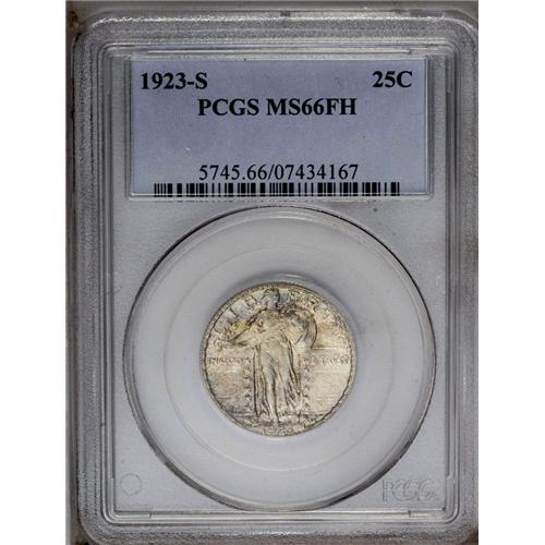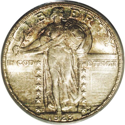 <B>1923-S<25C> MS66 Full Head PCGS.</B></I> This is an amazing Gem with exceptional design detail on both sides. Liberty's head is completely detailed and every shield rivet is visible, although the two next to the body are extremely faint. The surfaces are fully lustrous with frosty silver color traces of iridescent toning at the upper obverse and lower reverse. A splendid coin for the advanced connoisseur. Population: 26 in 66, 4 finer (4/06).