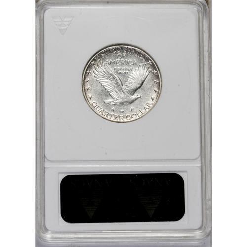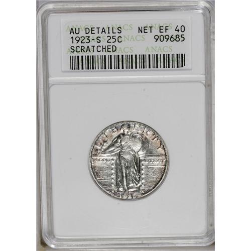 <B>1923-S<25C>--Scratched--ANACS. AU Details, Net XF40.</B></I> This bright and partially lustrous better date quarter has rose and powder-blue borders. A pair of wispy marks are west of the left (facing) wing, but these are far less important than the ANACS label asserts. Liberty's leg and the date display light wear.