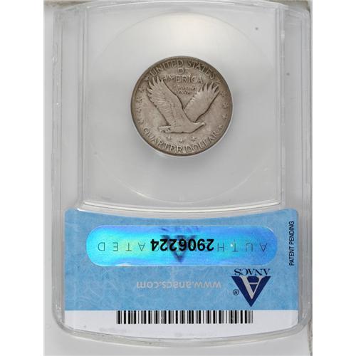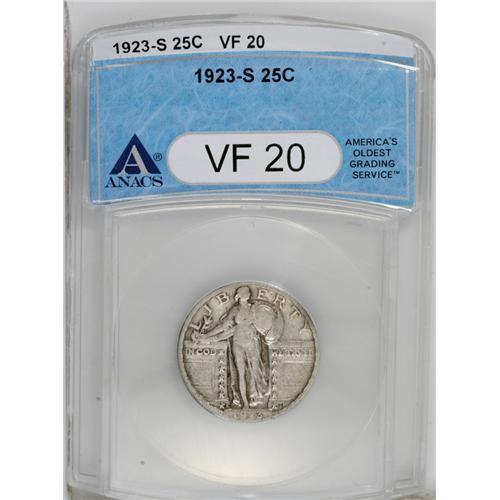 <B>1923-S 25C VF20 ANACS.</B></I> The soft silver-gray surfaces of this mid-grade quarter have hints of blue and rose on the reverse. Few marks are apparent on the surfaces.<BR><BR><b>Shipping:</b> Coin/Currency (<a target="_blank" href="http://www.heritageauctions.com/common/shipping.php">view shipping information</a>)