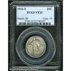1923-S 25C VF25 PCGS. This key date features pleas <B>1923-S 25C VF25 PCGS.</B></I> This key date features pleasing light gray surfaces that are relatively clean, showing just a couple of minute marks in the upper right obverse field, and on the eagle's left wing. The design elements are nicely detailed, though the numerals 192 in the date are weak. <BR><BR><B>Important notice:</B> Heritage usually auctions material at the rate of 200-250 lots per hour. On some occasions eBay Live bid software or the Internet may not be able to keep up with the pace of the auction. We recommend placing a realistic absentee bid now as insurance to avoid disappointment. Occasionally the auctioneer may eliminate or reject an eBay Live bid, and the auctioneer may also reopen a lot after the close of the eBay live bidding (usually because we missed an audience bid), and may reject your bid even if it shows you as the winning bidder. By bidding via eBay Live, you agree that Heritage may award the lot to another bidder at its sole discretion under the circumstances described above or any other reasonable circumstances. Since eBay bids are not shown to us until we open the lot on the floor, we treat those bids just like floor bids. In most cases the floor responds before the eBay bid is presented to us, due to Internet lag time, so for consistency we have made it a policy that floor bids are always considered first over tie eBay live bids. Also please note that all Heritage lots purchased through eBay Live carry a 20% Buyer's Premium. Please make sure you read the Terms and Conditions before you bid. This lot is being auctioned in conjunction with a live floor auction by Heritage Galleries & Auctioneers. All final auction and invoice information will be supplied by Heritage Galleries & Auctioneers, and all other information should be considered preliminary. Lot:5952