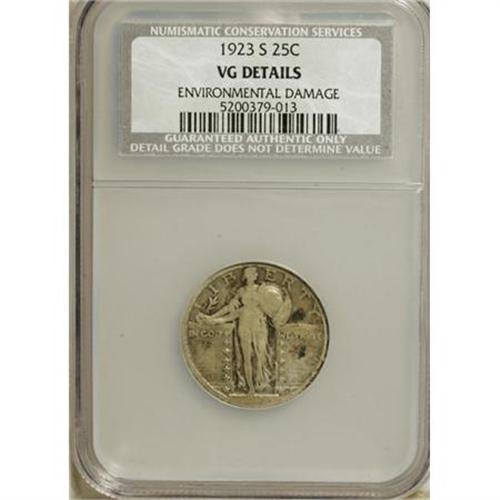 <B>1923-S 25C --Environmental Damage--NCS. VG Details.</B></I> NGC Census: (3/328). PCGS Population (5/655). Mintage: 1,360,000. Numismedia Wsl. Price for NGC/PCGS coin in VG8 : $360. (#5744)<BR><BR><B>Coin Engraver:</B> Hermon A. MacNeil<BR><BR><b>Shipping:</b> Coins & Currency (<a target="_blank" href="http://www.heritageauctions.com/common/shipping.php">view shipping information</a>)