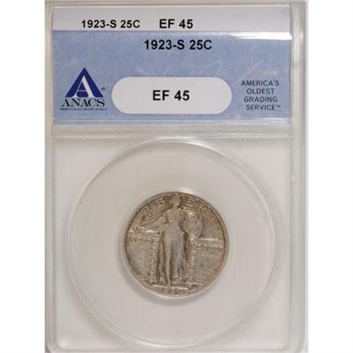 <B>1923-S 25C XF45 ANACS.</B></I> Substantial design details remain evident on each side of this Choice XF example, for the grade. Light champagne accents appear over the medium-gray surfaces. Lightly worn with a few wispy hairlines in the reverse fields. <BR><BR><B>Coin Engraver:</B> Hermon A. MacNeil<BR><BR><b>Shipping:</b> Coins & Currency (<a target="_blank" href="http://www.heritageauctions.com/common/shipping.php">view shipping information</a>)