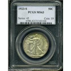 <table><tr><td><TABLE cellSpacing=0 cellPadding=0 width="100%" bgColor=#000000 border=0><TBODY> <TR><TD width="100%"><TABLE cellSpacing=1 cellPadding=3 width="100%" border=0><TBODY><TR><TD width="100%" bgColor=#79735c><FONT face=arial color=#ffffff size=3><B>Description</B> </FONT></TD></TR><TR><TD width="100%" bgColor=#ffffff><FONT face=arial size=2><B>1923-S 50C MS63 PCGS.</B></I> A very scarce early Walker, and one that is generally not found well struck or in Mint State. This is a lustrous example that has a typical strike and just a few luster grazes in the right obverse field. While this coin is not completely struck up, there certainly are above average striking details for the issue. The olive-gold obverse patina, combined with dappled russet rim toning, covers satiny, carefully preserved surfaces. The reverse displays rich champagne-gray toning, and is nearly mark-free, with its own share of slight russet mottling. These elements combine to create a pleasing appearance, always important to the astute collector. </FONT></TD></TR></TBODY></TABLE></TD></TR></TBODY></TABLE><BR><A name=PricesRealized></A><TABLE cellSpacing=0 cellPadding=0 width="100%" bgColor=#000000 border=0><TBODY><TR><TD width="100%"><TABLE cellSpacing=1 cellPadding=3 width="100%" border=0><TBODY><TR><TD width="100%" bgColor=#79735c><A name=PR><FONT face=arial color=#ffffff size=3><B>Previous Prices from Heritage Auctions</B> </FONT></A></TD></TR><TR><TD bgColor=#f6f6ed><TABLE cellSpacing=0 cellPadding=0 width="100%" border=1><TBODY><TR><TD align=middle width="33%"><B>Date</B></TD><TD align=middle width="33%"><B>Service</B></TD><TD align=middle width="33%"><B>Price</B></TD></TR><TR bgColor=whitesmoke><TD width="33%"><B>03/23/2003</B></TD><TD width="33%">PCGS</TD><TD width="33%">$3,680.00</TD></TR><TR bgColor=whitesmoke><TD width="33%"><B>06/08/2002</B></TD><TD width="33%">ANACS</TD><TD width="33%">$1,725.00</TD></TR><TR bgColor=whitesmoke><TD width="33%"><B>01/12/2002</B></TD><TD width="33%">ANACS</TD><TD width="33%">$2,875.00</TD></TR><TR bgColor=whitesmoke><TD width="33%"><B>04/28/1995</B></TD><TD width="33%">PCGS</TD><TD width="33%">$2,420.00</TD></TR><TR bgColor=whitesmoke><TD width="33%"><B>01/01/1999</B></TD><TD width="33%">PCGS</TD><TD width="33%">$2,875.00</TD></TR></TBODY></TABLE></TD></TR><TR><TD bgColor=#ffffff><FONT face=arial size=1 ?>PLEASE NOTE: All prices realized reflect the final hammer price PLUS the buyer's premium in auctions that charge a buyer's premium. Each item has a notation at the top of the listing indicating whether that lot included a buyer's premium. Example: A item that sells with a final hammer price of $100 and a 20% buyer's premium will display with a price realized of $120. All information listed is intended to be as accurate as possible, but errors are possible. Please use this guide carefully and inform us of any inaccuracies. </FONT></TD></TR></TBODY></TABLE></TD></TR></TBODY></TABLE><BR><TABLE cellSpacing=0 cellPadding=0 width="100%" bgColor=#000000 border=0><TBODY><TR><TD width="100%"><TABLE cellSpacing=1 cellPadding=3 width="100%" border=0><TBODY><TR><TD width="100%" bgColor=#79735c colSpan=6><FONT face=arial color=#ffffff size=3><B>Price Guide*</B> </FONT></TD></TR><TR bgColor=#f6f6ed><TD align=middle><B>Grade</B> </TD><TD align=middle><B>Coin World<BR>(Trends)</B> </TD><TD align=middle><B>Numismedia<BR>Retail</B> </TD><TD align=middle><B>Numismedia<BR>Wholesale</B> </TD><TD align=middle><B>Coin<BR>Universe</B> </TD><TD align=middle><B>Heritage<BR>Value Index</B> </TD></TR><TR bgColor=#ffffff><TD align=middle>62</TD><TD align=right>$2,500.00</TD><TD align=right>---</TD><TD align=right>$1,425.00</TD><TD align=right>---</TD><TD align=right>$1,855.00</TD></TR><TR style="FONT-WEIGHT: bold" bgColor=#cccfdd><TD align=middle>63</TD><TD align=right>$4,000.00</TD><TD align=right>---</TD><TD align=right>$2,575.00</TD><TD align=right>$3,400.00</TD><TD align=right>$2,551.67</TD></TR><TR bgColor=#ffffff><TD align=middle>64</TD><TD align=right>$5,000.00</TD><TD align=right>---</TD><TD align=right>$3,925.00</TD><TD align=right>$5,600.00</TD><TD align=right>$3,860.00</TD></TR><TR bgColor=#ffffff><TD colSpan=6><FONT size=1>*All information listed is intended to be as accurate as possible, but errors are possible. No item may be returned or refused based on this information which is provided as a service to our customers. You should contact each pricing source directly to determine the accuracy of this information. </FONT></TD></TR></TBODY></TABLE></TD></TR></TBODY></TABLE><BR><TABLE cellSpacing=0 cellPadding=0 width="100%" bgColor=#000000 border=0><TBODY><TR><TD width="100%"><TABLE cellSpacing=1 cellPadding=3 width="100%" border=0><TBODY><TR><TD width="100%" bgColor=#79735c><FONT face=arial color=#ffffff size=3><B>Population Guide</B> </FONT></TD></TR><TR bgColor=#ffffff><TD align=middle><!-- Begin Output of Population Grid--><TABLE cellSpacing=0 cellPadding=0 width="100%" border=0><TBODY><TR><TD vAlign=center><TABLE cellSpacing=0 width="100%" border=1 cellsadding="3"><TBODY><TR><TD vAlign=center><TABLE cellSpacing=0 cellPadding=3 width="100%" border=1><TBODY><TR><TD vAlign=center align=middle bgColor=#f0f1e8 colSpan=2 <CENTER><FONT face=Arial size=2><B>PCGS Pop </B></FONT><CENTER></CENTER></TD><TD vAlign=center align=middle bgColor=#f0f1e8 colSpan=2><CENTER><FONT face=Arial size=2><B>NGC Pop</B></CENTER></FONT></TD></TR><TR><TD vAlign=center><FONT face=Arial size=2>(63)</FONT> </TD><TD vAlign=center align=right><FONT face=Arial size=2>52</FONT> </TD><TD vAlign=center><FONT face=Arial size=2>(63)</FONT> </TD><TD vAlign=center align=right><FONT face=Arial size=2>45</FONT> </TD></TR><TR><TD vAlign=center><FONT face=Arial size=2>(>63)</FONT> </TD><TD vAlign=center align=right><FONT face=Arial size=2>141</FONT> </TD><TD vAlign=center><FONT face=Arial size=2>(>63)</FONT> </TD><TD vAlign=center align=right><FONT face=Arial size=2>99</FONT> </TD></TR></TBODY></TABLE></TD></TR></TBODY></TABLE></