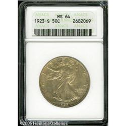 <B>1923-S 50C MS64 ANACS.</B></I> A near-Gem example of this difficult early Walker. Lightly toned and showing only a few light marks on the obverse. Remarkably well struck for a coin of this issue with some detail evident even on the hand of Liberty. Lot:7997