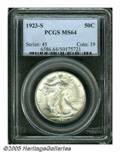 <B>1923-S<50C> MS64 PCGS.</B></I> An attractive upper-end coin that is close to grading MS65, and there is really no one single factor that keeps it from doing so. The strike is especially strong for this issue with fairly good definition on the hand, head, and even some on the skirt lines. Bright, pleasing luster is unbroken over both sides. Collectors have found this issue to be one of the three or four scarcest in the entire Walking Liberty series.