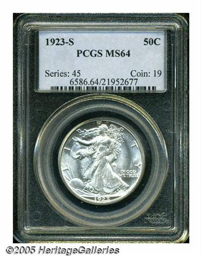 <B>1923-S<50C> MS64 PCGS.</B></I> Bright mint luster covers both sides of this impressive early Walker. The lovely mint frost is enhanced by a complete, untoned snow-white appearance overall. A better than average strike shows, particularly on the reverse, for this always-weak issue.