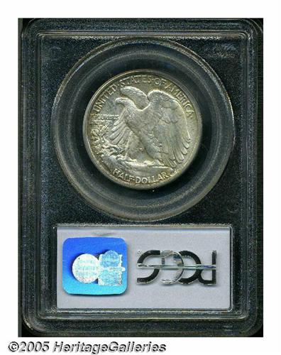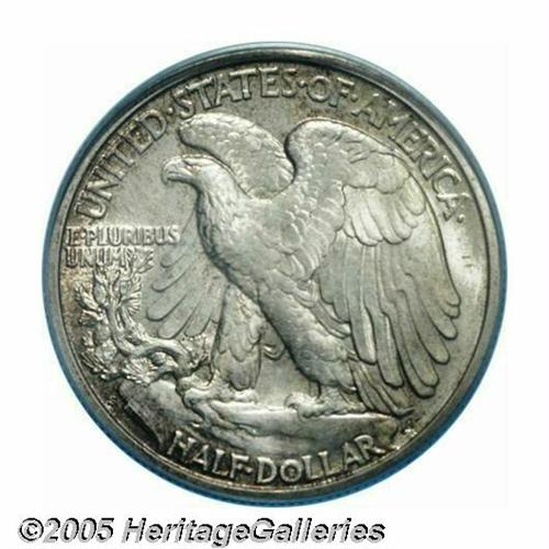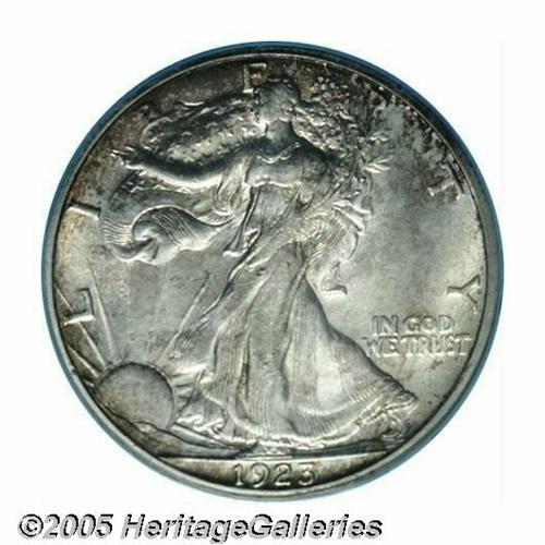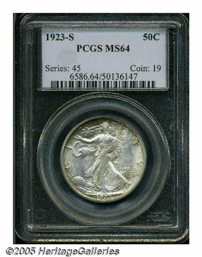 <B>1923-S<50C> MS64 PCGS.</B></I> The '23-S is the only Walker of the 1922-1926 era. It seems likely, therefore, that most of the 2.1 million coins produced would have entered circulation and remained there for many years. Indeed, this issue is difficult to locate in circulated grades above the VF level. Mint State coins, of course, are scarce and always in demand. This is a satiny finished example with a modest glow in the fields. Sprays of russet-tinged iridescence are seen at the border areas on both sides with silver-gray centers. With no evident distractions, this coin would probably grade even finer were the striking definition more full. Population: 110 in 64, 47 finer (5/05).