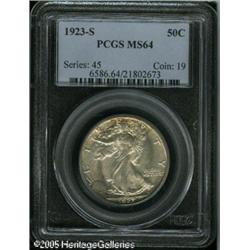 <B>1923-S 50C MS64 PCGS.</B></I> This more elusive S-mint displays excellent sharpness, being also endowed with bright, satiny surfaces that show only a few well scattered and inconsequential marks. Speckles of golden-orange toning partially frame the obverse. <BR><I>From The William & Harrison Hiatt Registry Collection, Part Two.</B></I> Lot:7998