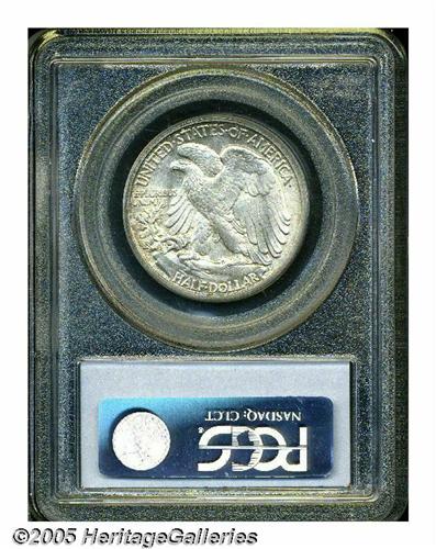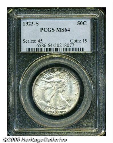 <B>1923-S<50C> MS64 PCGS.</B></I> Uncommonly sharp with just the faintest bit of softness over the highpoints, and as such quite an exceptional coin and one that should be of considerable interest to the collector. One shouldn't take something like luster for granted, but on 1923-S Walkers one can generally assume it will be strong and thickly frosted--and so it is on this piece. Mostly untoned, there is just the slightest hint of color around the margins. Population: 117 in 64, 48 finer (5/05).