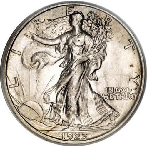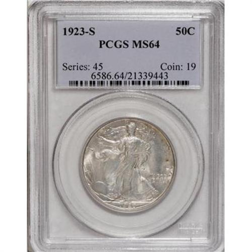 <B>1923-S 50C MS64 PCGS.</B></I> A beautiful Choice low mintage half that offers delicate tan-gold toning. Sharply struck save for inescapable softness on the branch hand. The right-side border has a couple of russet freckles, but both sides are remarkably unabraded. The fields are striated, as made from mint-polished dies.<BR><BR><B>Coin Engraver:</B> Adolph A. Weinman<BR><BR><b>Shipping:</b> Coins & Currency (<a target="_blank" href="http://www.heritageauctions.com/common/shipping.php">view shipping information</a>)