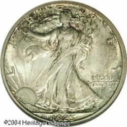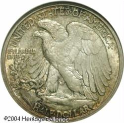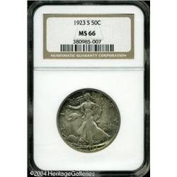 1923-S 50C MS66 NGC. Iridescent golden-brown, sky- <B>1923-S 50C MS66 NGC.</B></I> Iridescent golden-brown, sky-blue, and russet patina fills the margins, while the centers possess pearl-gray color. A lustrous and exceptionally preserved premium Gem that will impress even the most demanding collector. The strike is quite sharp, since the skirt lines are essentially complete, the thumb on the branch hand is outlined, and Liberty's head has pleasing definition. A difficult issue to find in any Mint State grade, most Uncirculated pieces are in MS62 to MS64 grades. Gems are rare, and undisturbed premium Gems of the present quality are very rare and under enormous pressure from specialists of this always popular series. Population: 6 in 66, 1 finer (11/04). <BR><BR><B>Important notice:</B> Heritage usually auctions material at the rate of 200-250 lots per hour. On some occasions eBay Live bid software or the Internet may not be able to keep up with the pace of the auction. We recommend placing a realistic absentee bid now as insurance to avoid disappointment. Occasionally the auctioneer may eliminate or reject an eBay Live bid, and the auctioneer may also reopen a lot after the close of the eBay live bidding (usually because we missed an audience bid), and may reject your bid even if it shows you as the winning bidder. By bidding via eBay Live, you agree that Heritage may award the lot to another bidder at its sole discretion under the circumstances described above or any other reasonable circumstances. Since eBay bids are not shown to us until we open the lot on the floor, we treat those bids just like floor bids. In most cases the floor responds before the eBay bid is presented to us, due to Internet lag time, so for consistency we have made it a policy that floor bids are always considered first over tie eBay live bids. Also please note that all Heritage lots purchased through eBay Live carry a 20% Buyer's Premium. Please make sure you read the Terms and Conditions before you bid. This lot is being auctioned in conjunction with a live floor auction by Heritage Galleries & Auctioneers. All final auction and invoice information will be supplied by Heritage Galleries & Auctioneers, and all other information should be considered preliminary. Lot:6167