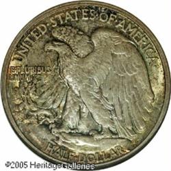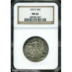 <B>1923-S 50C MS66 NGC.</B></I> Iridescent golden-brown, sky-blue, and russet patina fills the margins, while the centers possess pearl-gray color. A lustrous and exceptionally preserved premium Gem that will impress even the most demanding collector. The strike is quite sharp, since the skirt lines are essentially complete, the thumb on the branch hand is outlined, and Liberty's head has pleasing definition. A difficult issue to find in any Mint State grade, most Uncirculated pieces are in MS62 to MS64 grades. Gems are rare, and undisturbed premium Gems of the present quality are very rare and under enormous pressure from specialists of this always popular series. Population: 6 in 66, 1 finer (1/05). Lot:7999