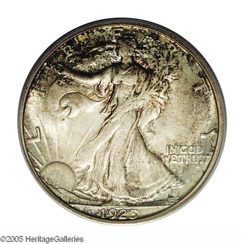 <B>1923-S<50C> MS66 PCGS.</B></I> Iridescent turquoise-blue, golden-brown, and russet patina fills the margins, while the centers possess pearl-gray color. A lustrous and exceptionally preserved premium Gem that will impress even the most demanding collector. The strike is quite sharp, since the skirt lines are essentially complete, the thumb on the branch hand is outlined, and Liberty's head has pleasing definition. A difficult issue to find in any Mint State grade, most Uncirculated pieces are in MS62 to MS64 grades. Gems are rare, and undisturbed premium Gems of the present quality are very rare and under enormous pressure from specialists of this always popular series. Population: 11 in 66, 1 finer (10/05).