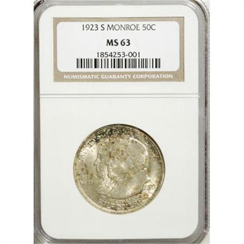 <B>1923-S 50C Monroe MS63 NGC.</B></I> NGC Census: (842/1738). PCGS Population (1048/1686). Mintage: 274,077. Numismedia Wsl. Price for NGC/PCGS coin in MS63: $121. (#9333)<BR><I>From The Frank DuVall Collection of U.S. Commemoratives.</B></I><BR><BR><b>Shipping:</b> Coins & Currency (<a target="_blank" href="http://www.heritageauctions.com/common/shipping.php">view shipping information</a>\)
